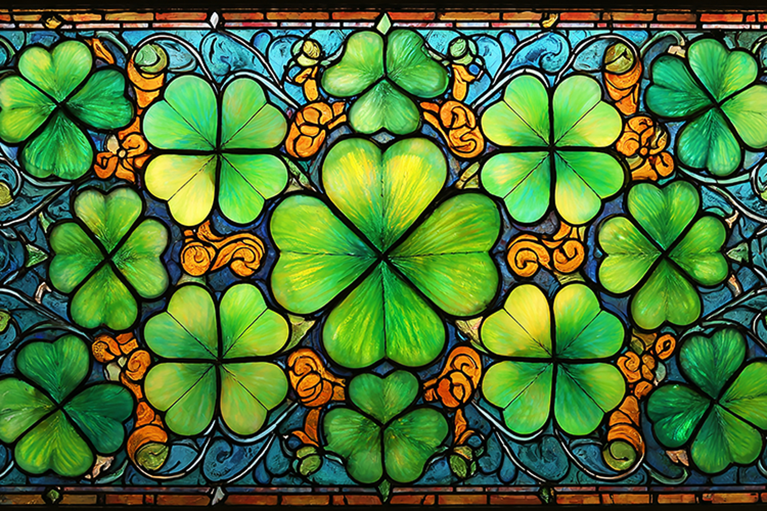 A vibrant stained glass window featuring a colorful shamrock