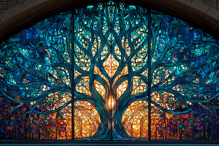 This image features a breathtaking stained glass window showcasing a tree of life, crafted with vibrant colors and intricate details. The tree's branches and leaves are expertly woven into the glasswork, creating a stunning visual effect. The window's arched shape adds to its beauty, making it a masterpiece of art and design.