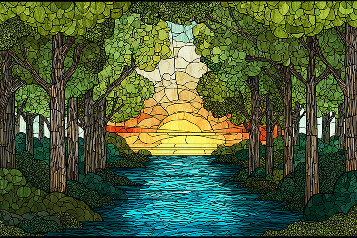 A vibrant stained glass artwork depicting a serene forest