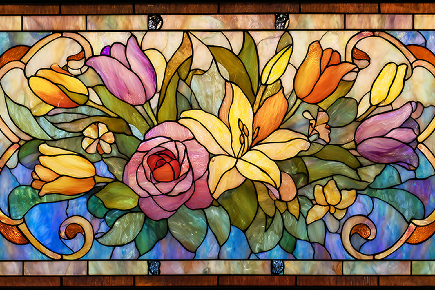 A beautiful stained glass window with colorful flowers