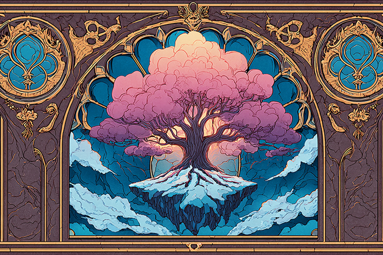 A stunning illustration of a pink tree standing on a cliff surrounded by clouds and ornate gold designs, evoking a sense of peace and serenity. The vibrant colors and whimsical design make for a unique and captivating image.