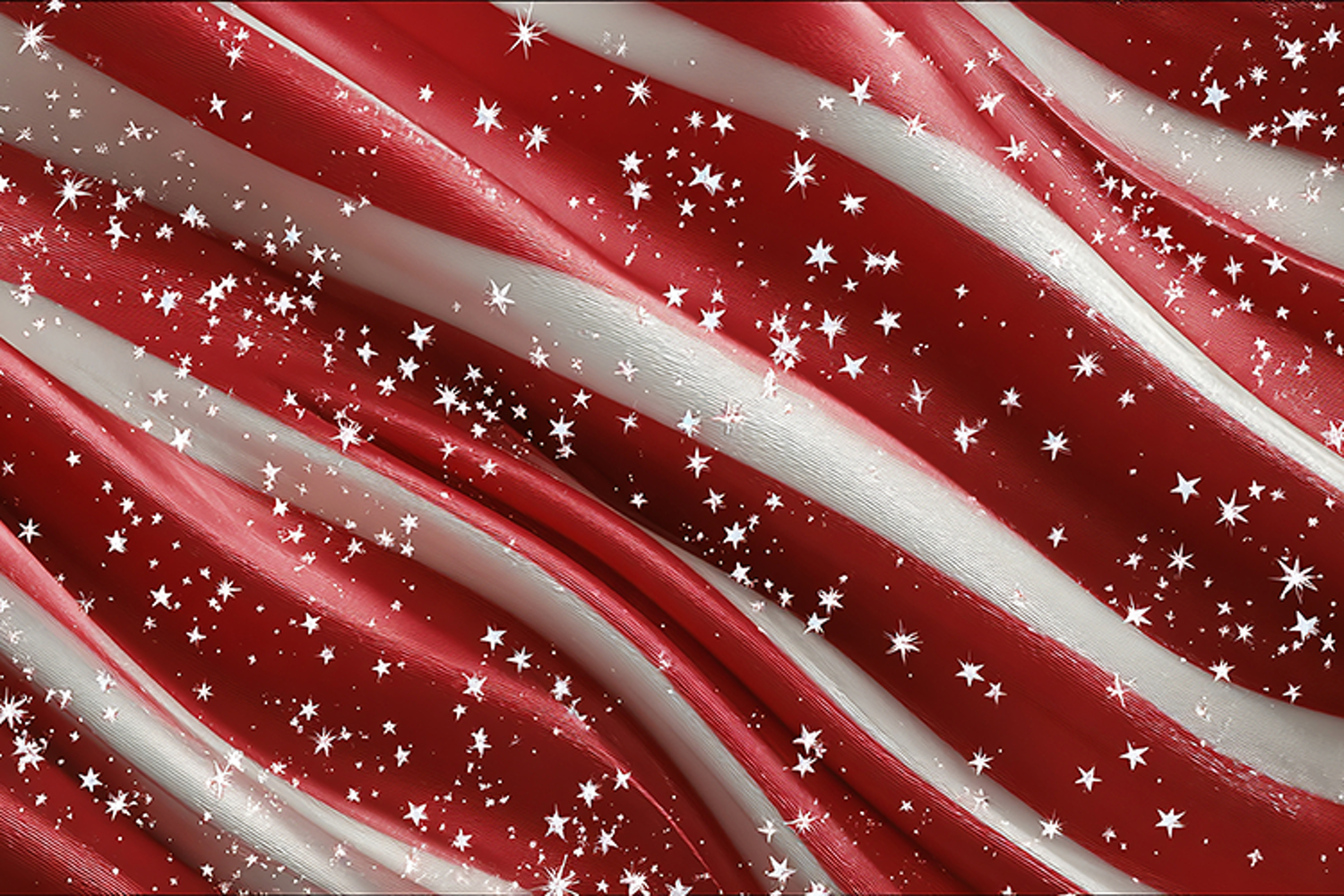 A close-up view of a red and white fabric with sparkling stars scattered across it, giving a festive and celebratory feel.