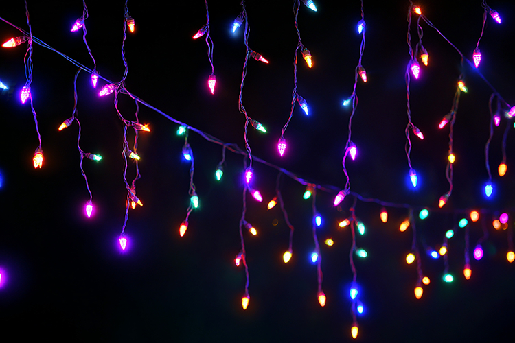 A string of colorful Christmas lights hanging in the dark, creating a festive and joyful atmosphere. The lights are vibrant and sparkling, adding a touch of magic to the scene.