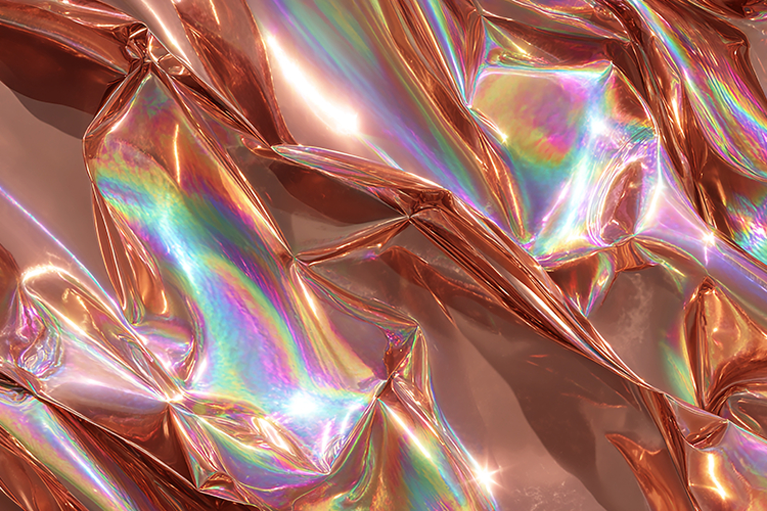 This image features a close-up view of shiny, crinkled, holographic foil with a rainbow of colors. The metallic material has a reflective, iridescent quality, creating a vibrant and modern design element. The texture and surface detail of the foil are prominently displayed, showcasing its unique properties.