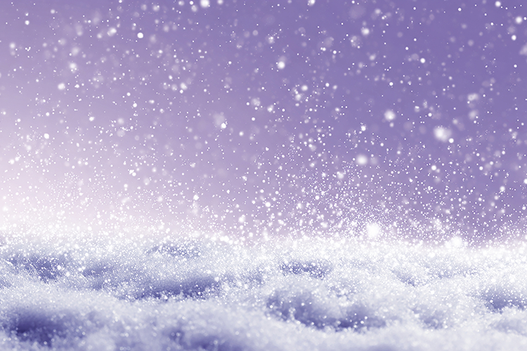 A serene winter landscape with snowflakes gently falling from a purple sky, creating a peaceful and calm atmosphere. The soft, white flakes cover the ground, adding to the tranquil scenery.