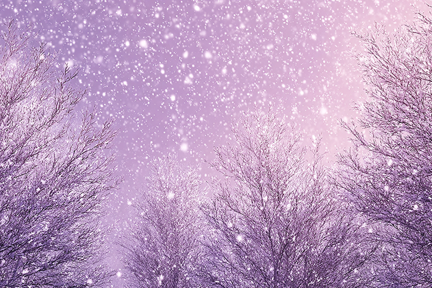A serene winter scene featuring snowflakes falling gently on bare trees set against a soft purple sky, evoking a sense of peacefulness and tranquility.