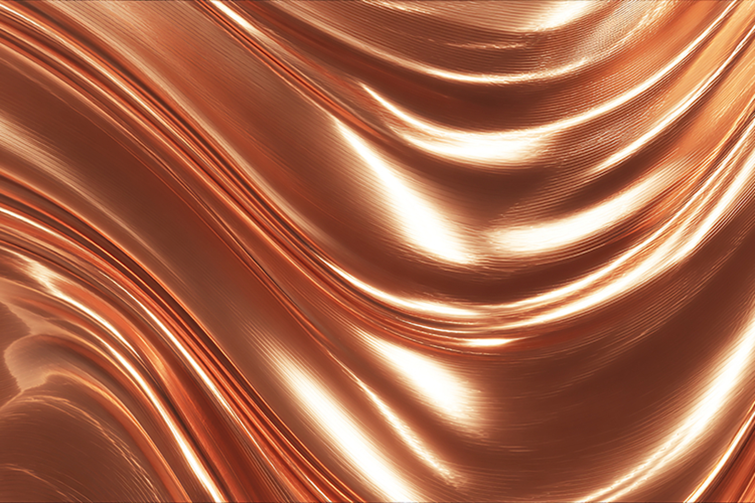This image features a close-up view of a luxurious, metallic copper fabric with smooth folds and curves. The shiny material has a modern and elegant appearance, making it suitable for various design applications.