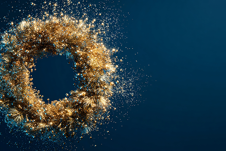 New Year Christmas Decoration Holiday Cheer Sparkling Lights Golden Wreath Dark Blue Background Festive Celebration Fireworks Display Sparkling Explosion Gold Sparks