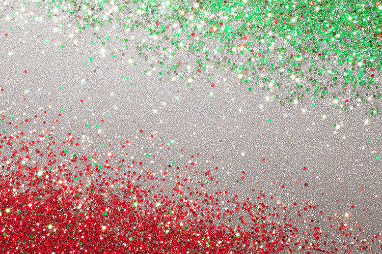 A vibrant glittery background with red, green, and silver