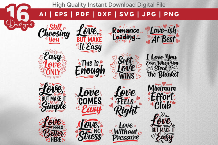 Level up your seasonal crafting with this Sarcastic & Simple Love SVG Bundle. Featuring 16 unique, hand-lettered designs, this collection is perfect for creators who want to mix sweet sentiments with a touch of wit. From the “Minimum Effort Club” to “Love-ish At Best,”