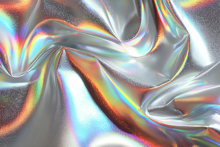 This image features a close-up view of a shiny, iridescent fabric with a mesmerizing rainbow color effect. The fabric appears to have a holographic sheen, giving it a luxurious and modern look. The abstract design and vibrant pattern make it a great element for fashion, interior design, or artistic projects.