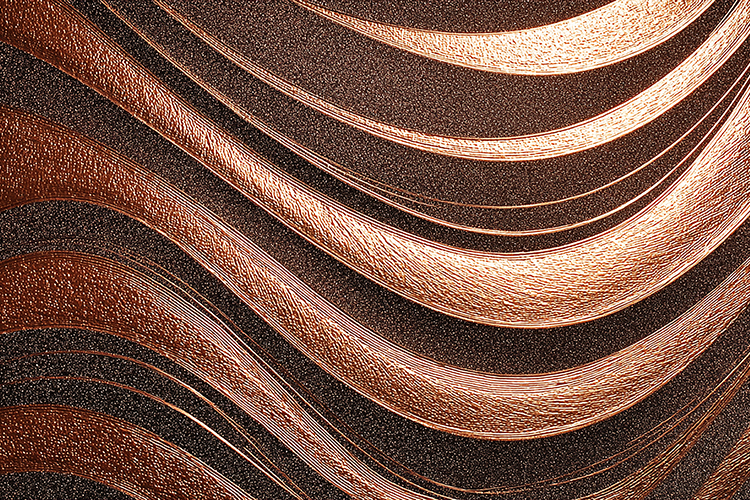 This image features a close-up view of a textured, wavy, copper-colored surface with abstract patterns. The metallic surface has a smooth, reflective finish with curved lines and shapes, giving it a modern and luxurious appearance.