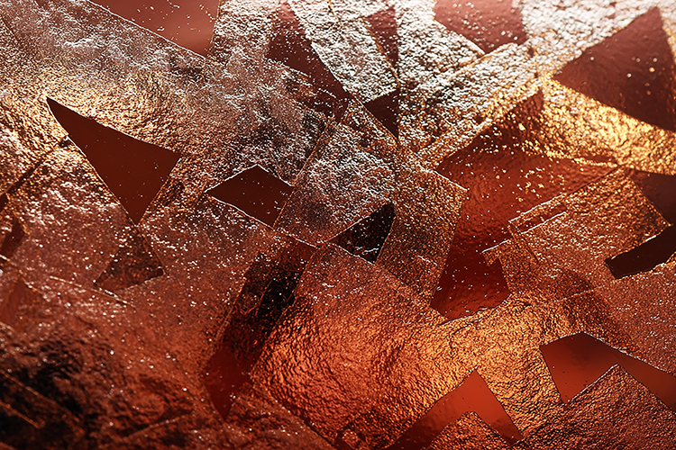 This image features a close-up view of a textured surface with triangular cutouts, illuminated by warm lighting that creates a sense of depth and visual interest. The metallic surface has a copper-like color with an orange glow, adding to its industrial and artistic appeal.