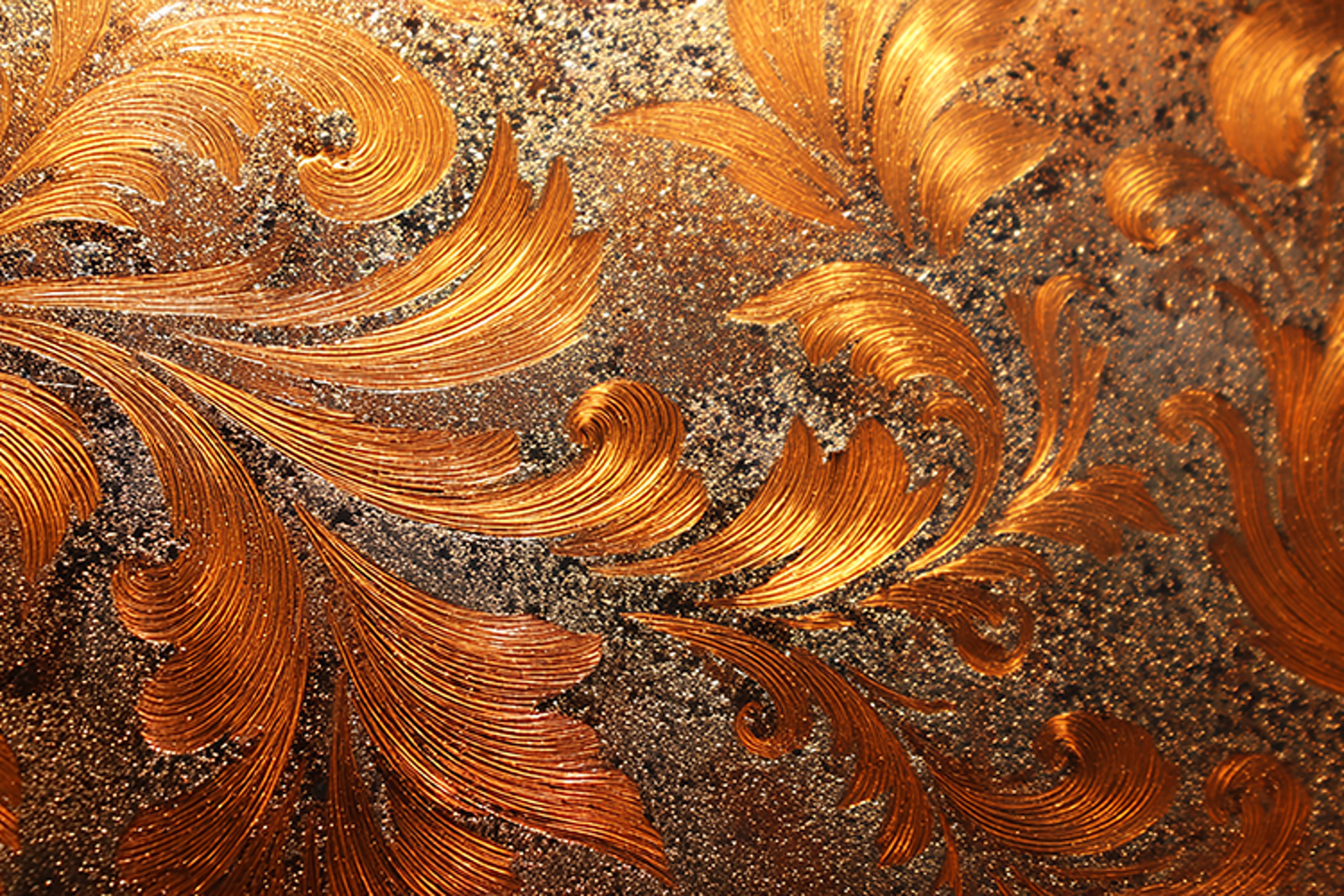A copper-colored floral pattern on a textured surface. The intricate design features curved, leaf-like shapes that create a sense of movement and luxury. The metallic finish adds a touch of elegance and sophistication.
