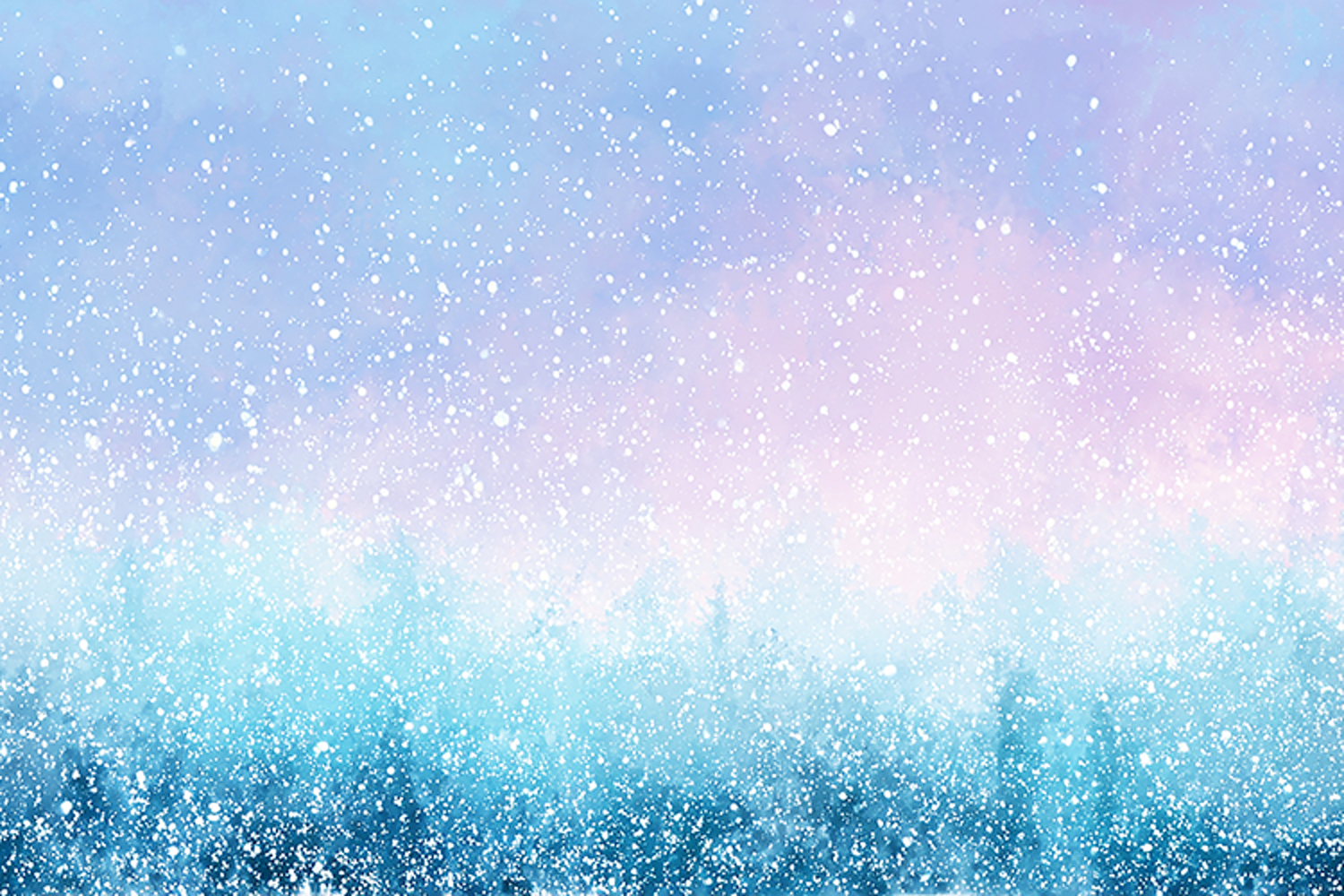 A peaceful snowy landscape with a soft pastel colored sky at dusk, featuring a gradient of blue, pink, and purple hues, with snowflakes gently falling from the sky.