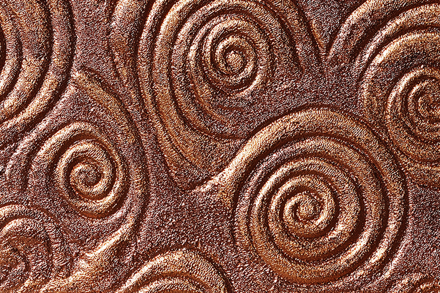 This image features a textured surface with swirling patterns. The brown metallic surface has a shiny appearance with spiral shapes that create a sense of movement and energy.