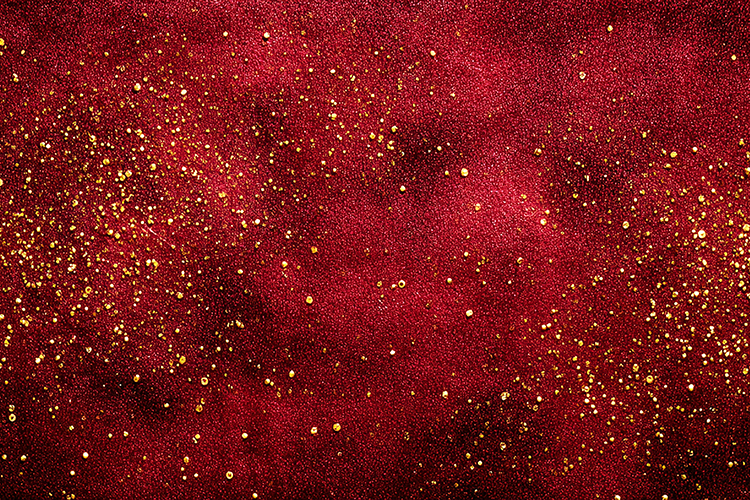 A vibrant red fabric with gold glitter specks scattered