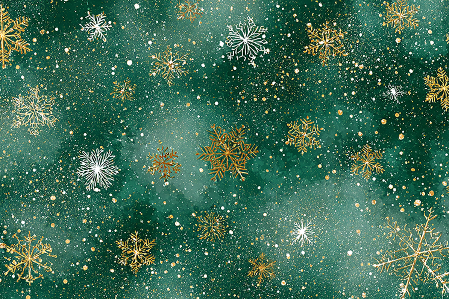 A festive holiday background featuring gold and white snowflakes on a green backdrop, perfect for Christmas decorations or winter-themed designs.