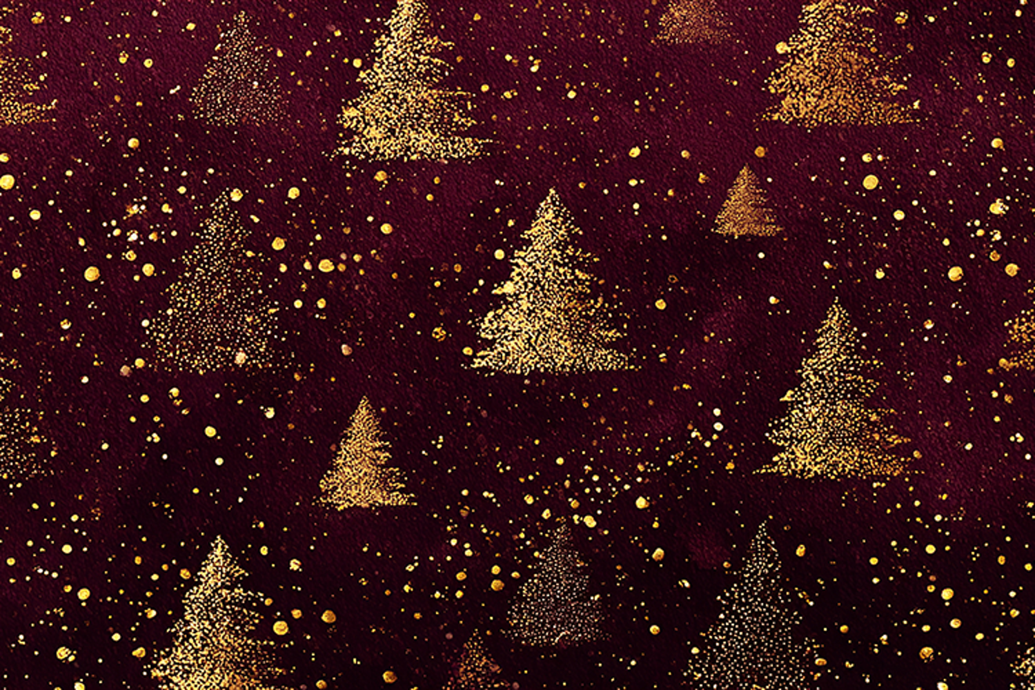 A beautiful and festive holiday background featuring gold glitter Christmas trees and snowflakes on a dark red and black background, perfect for seasonal decorations and celebrations.