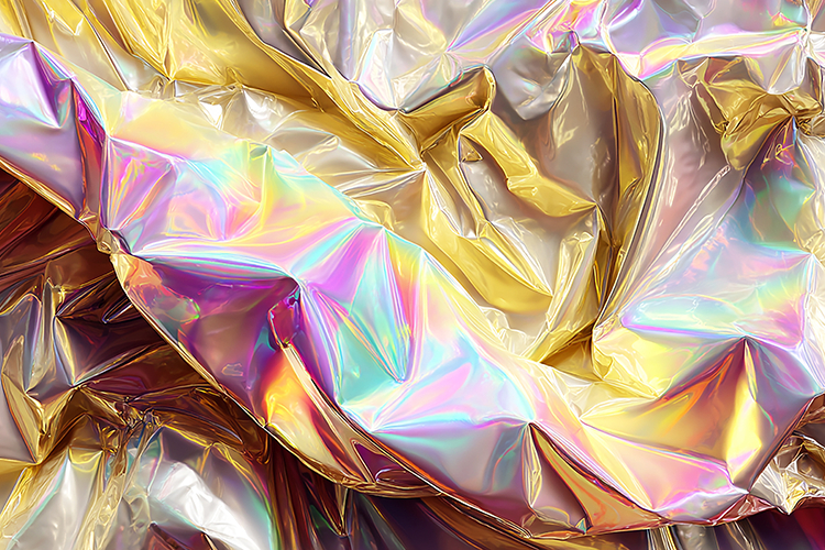 This image features a close-up view of crumpled metallic foil sheets with iridescent colors, showcasing a vibrant and abstract texture. The shiny, reflective surface displays a range of hues, creating a modern and artistic visual effect.