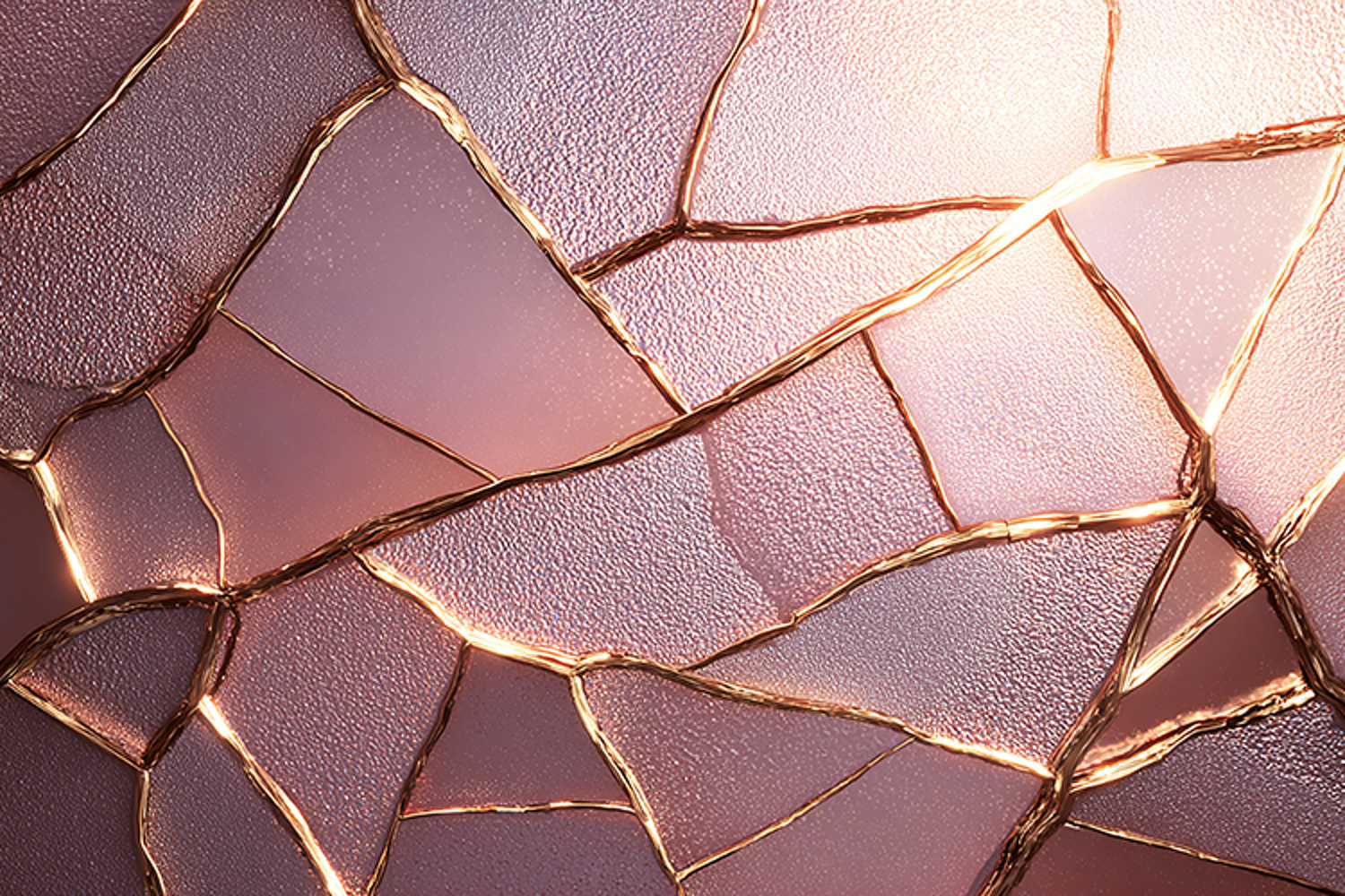 This image features a close-up view of a cracked pink surface with golden lines. The surface appears to be broken into fragments, creating a unique texture and pattern. The golden lines add a touch of luxury and modernity to the design.