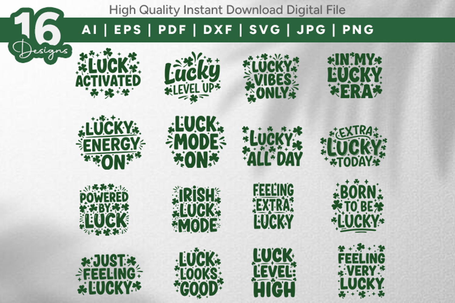 This collection includes modern, stacked text designs surrounded by clover accents, making them ideal for statement t-shirts, hoodies, tote bags, mugs, stickers, party decor, and more.