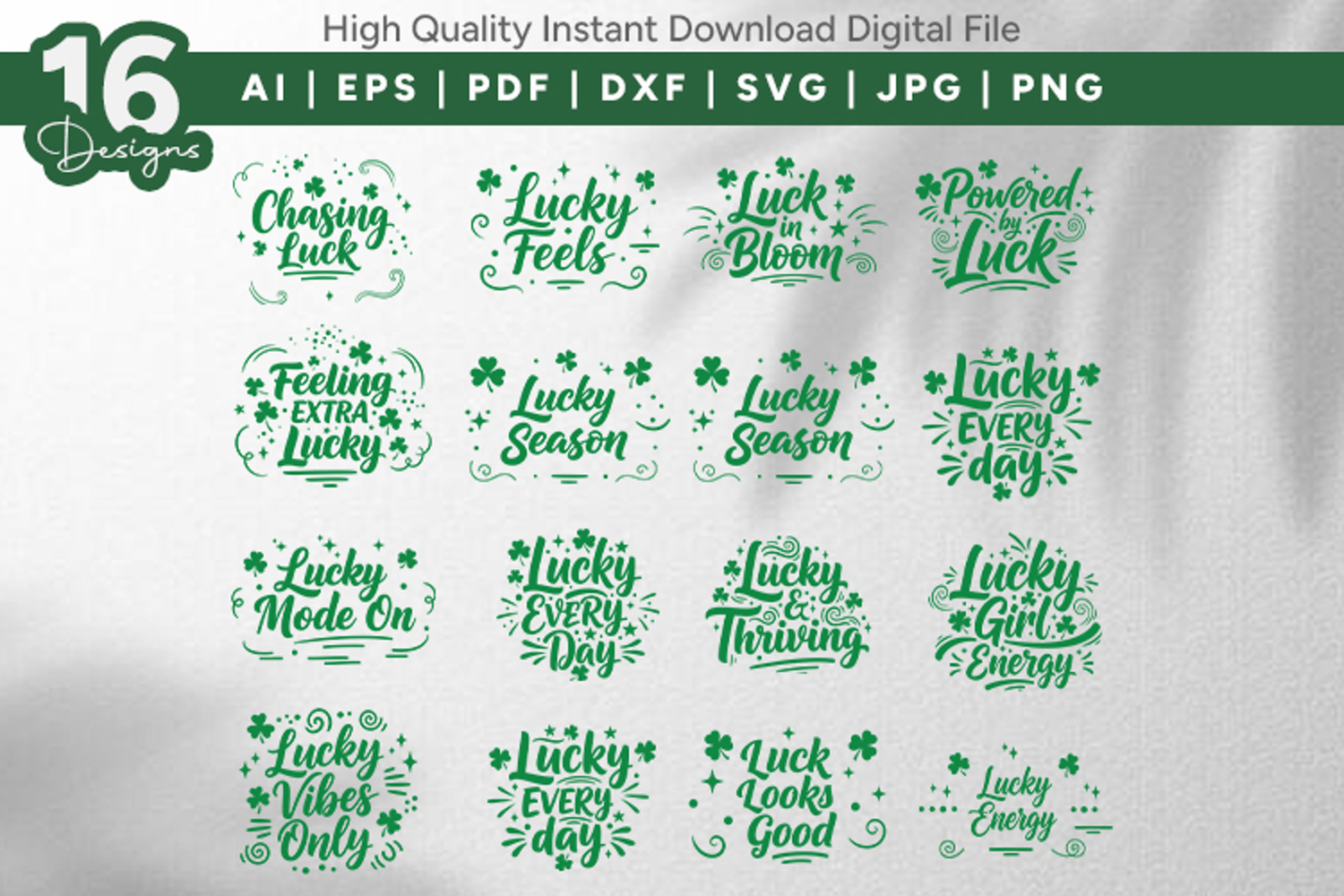 This collection includes trendy phrases like “Chasing Luck,” “Lucky Feels,” “Powered by Luck,” “Lucky Mode On,” “Lucky Thriving,” and more — all decorated with shamrock and clover accents for a festive touch.