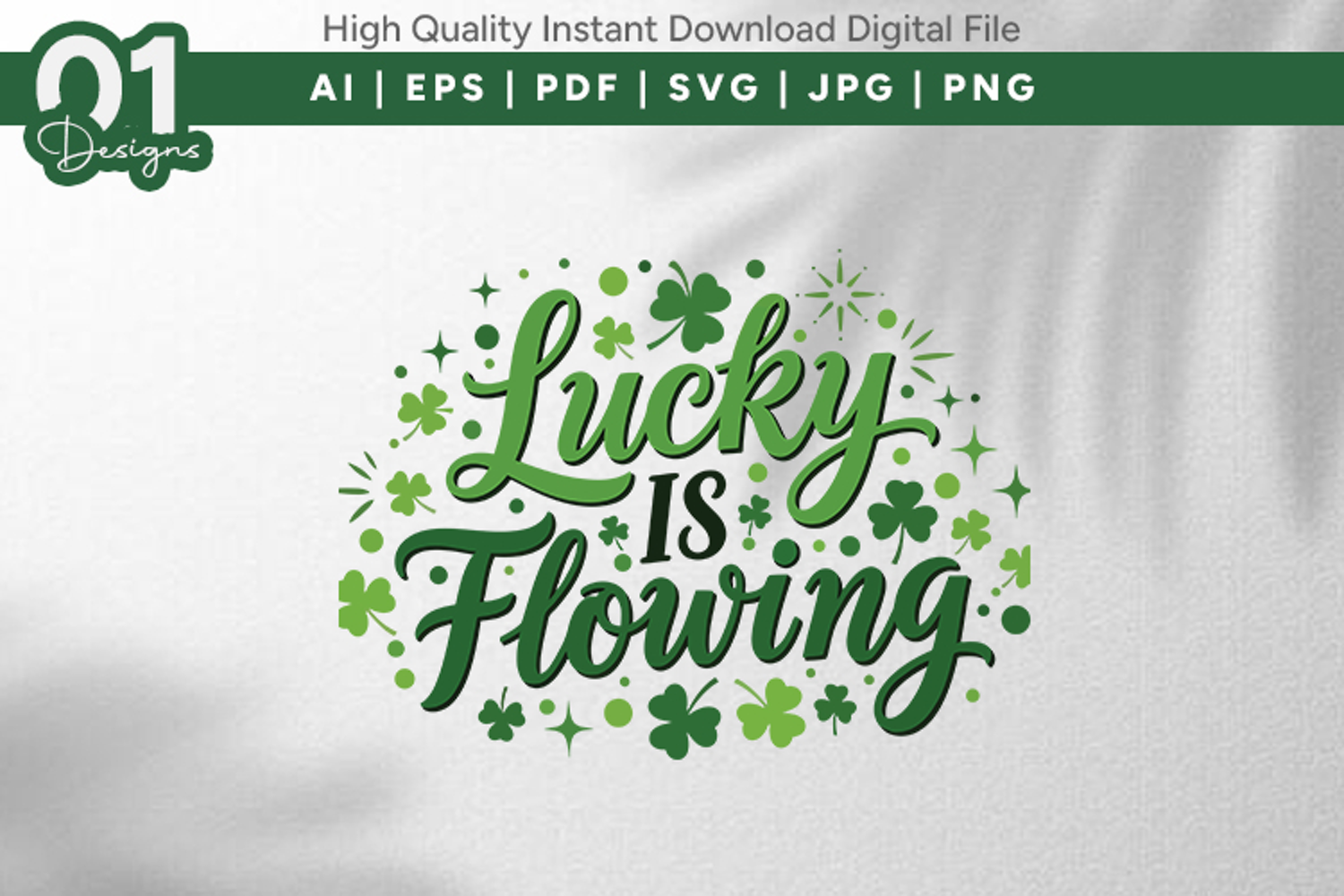 Lucky Is Flowing is a vibrant green typography quote surrounded by shamrock and sparkle accents, perfect for festive and seasonal crafting. Ideal for t-shirts, hoodies, mugs, wall art, vinyl decals, greeting cards, and more. High-quality digital cut file compatible with Cricut, Silhouette, sublimation, printing, and DIY creative projects. Instant download for and use.