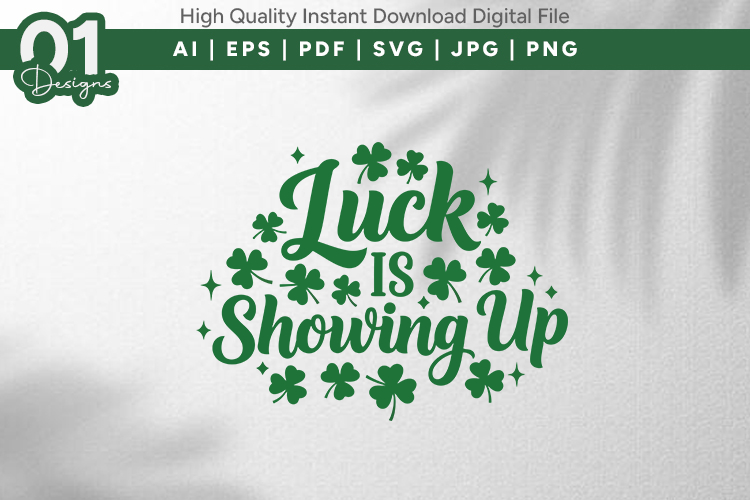 Luck Is Showing Up is a bold green typography quote surrounded by shamrocks and sparkle accents, perfect for festive and seasonal crafting. Ideal for t-shirts, hoodies, mugs, wall art, vinyl decals, greeting cards, and more. High-quality digital cut file compatible with Cricut, Silhouette, sublimation, printing, and DIY creative projects. Instant download for and use.
