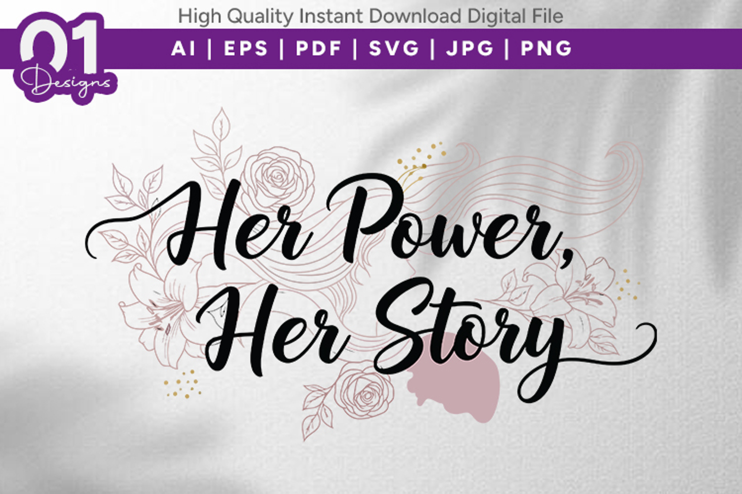 Celebrate women and empowerment with this elegant quote design: “Her Power, Her Story.” Featuring modern script typography with delicate floral line art and soft accents, this file is perfect for t-shirts, mugs, tote bags, stickers, wall art, journals, and sublimation crafts. A perfect choice for Women’s Day, March 8 projects, and inspirational gifts for her.