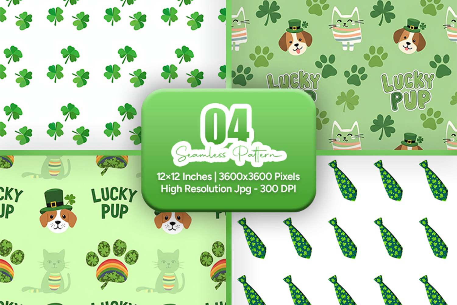 Create adorable holiday projects with this Lucky Pup St. Patrick seamless pattern pack. Featuring cute dogs and cats, shamrocks, paw prints, leprechaun hats, and festive green elements, these designs are perfect for pet lovers, sublimation, scrapbooking, fabric printing, mugs, tumblers, and more. Includes high-quality 12x12 inch JPG files (300 DPI), suitable for and use.