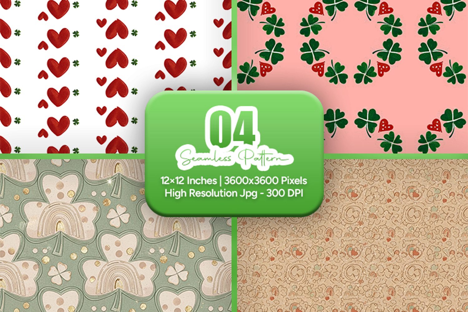 This seamless pattern bundle includes 4 high-resolution designs featuring red hearts, lucky clovers, and soft vintage-inspired backgrounds in charming festive tones. Each file is 12x12 inches (3600x3600 pixels) at 300 DPI in high-quality JPG format. Perfect for sublimation, scrapbooking, fabric printing, wrapping paper, planners, invitations, party decorations, and a wide range of creative craft projects. Smooth repeating tiles for professional print and digital use.