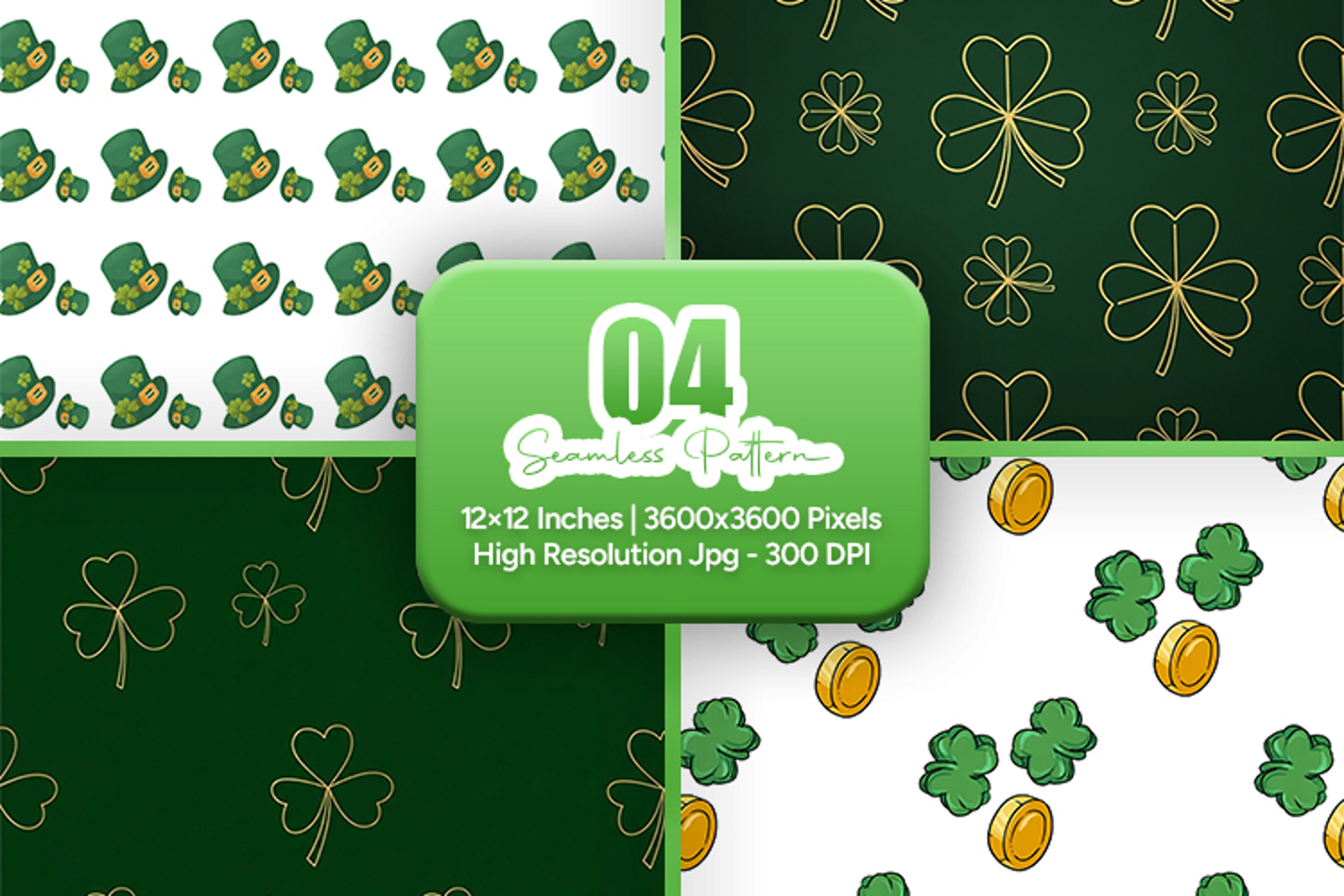 This seamless pattern bundle features 4 high-resolution designs with lucky green hats, elegant gold-outlined clovers, and gold coin accents in rich green tones. Each file is 12x12 inches (3600x3600 pixels) at 300 DPI in high-quality JPG format. Perfect for sublimation, scrapbooking, fabric printing, wrapping paper, planners, invitations, party decorations, and many creative craft projects. Smooth repeating tiles ensure professional results for both print and digital use.