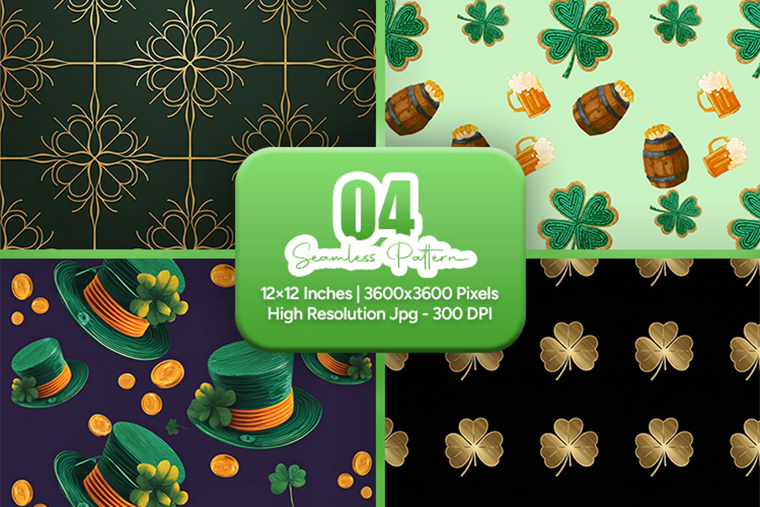 This seamless pattern bundle includes 4 high-resolution luxury designs featuring elegant gold clovers, geometric grid details, festive drink elements, green hats, and gold coin accents in rich green and black tones.