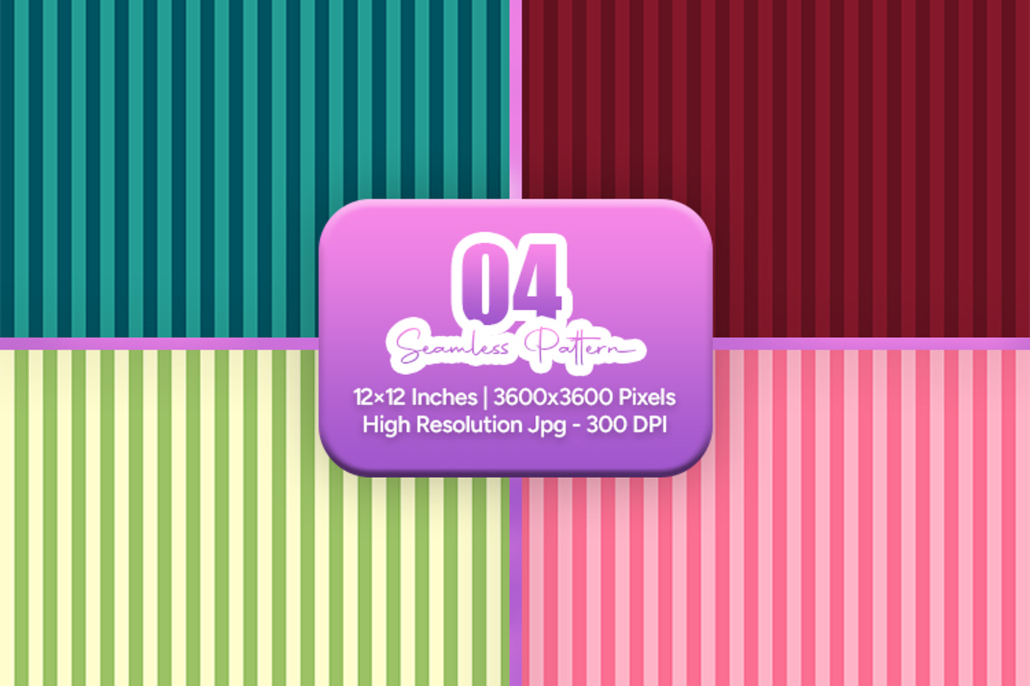 A vibrant collection of vertical stripe seamless patterns featuring teal, deep red, soft green, and pink color combinations. Perfect for scrapbooking, card making, planner layouts, fabric printing, sublimation, wrapping paper, wallpaper, and other creative projects. Each design is 12x12 inches in high-resolution JPG format at 300 DPI, ready for both print and digital use.