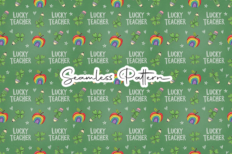 Playful seamless pattern featuring lucky teacher text, rainbow apples, shamrocks, and pencils on a soft green background. Perfect for fabric printing, sublimation, scrapbooking, wrapping paper, classroom decor, and seasonal craft projects. High quality digital paper ideal for teacher appreciation and festive themed designs.