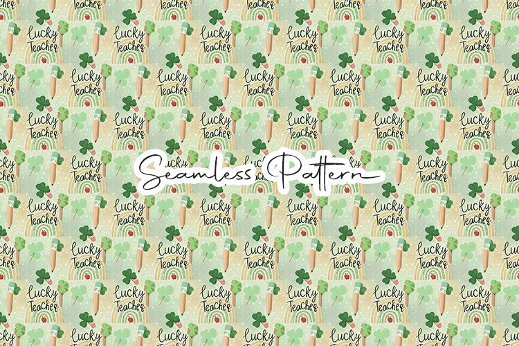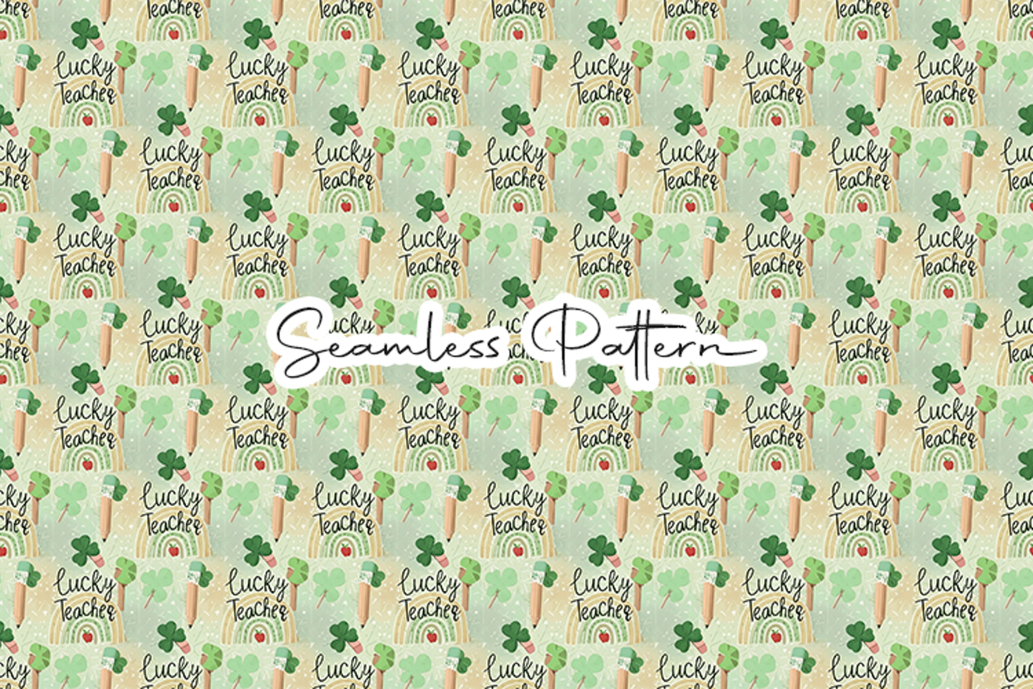 Soft and festive seamless pattern featuring lucky teacher text, shamrocks, pencils, and subtle rainbow accents on a light green background. Perfect for fabric printing, sublimation, scrapbooking, wrapping paper, classroom decor, and seasonal craft projects. High quality digital paper ideal for teacher appreciation and spring themed designs.