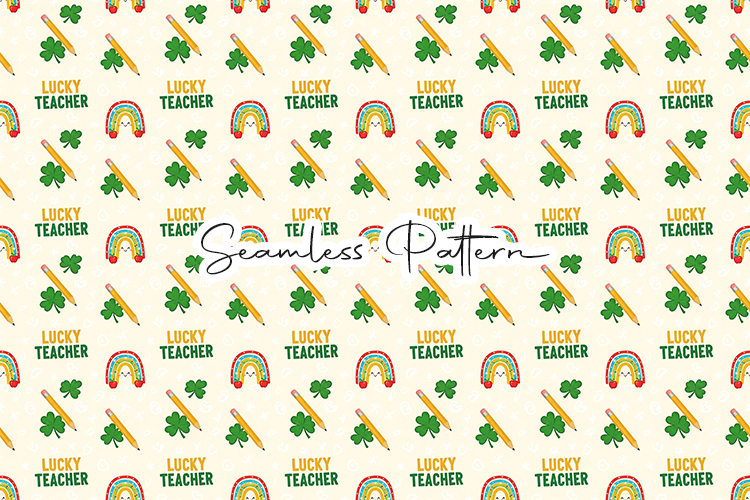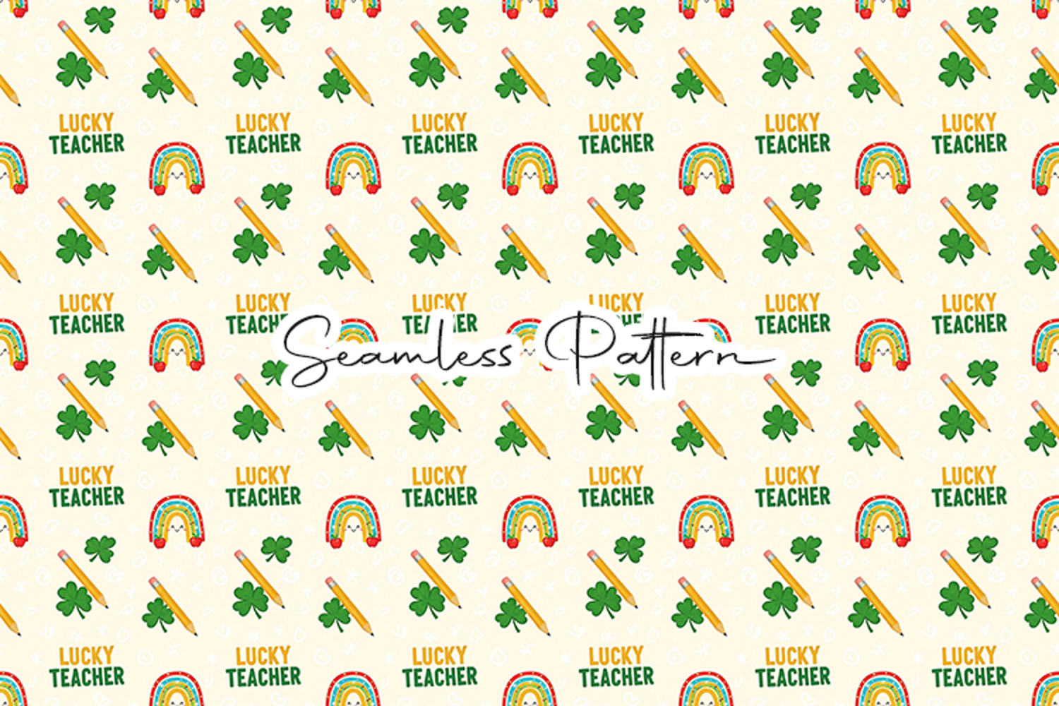 Bright and playful seamless pattern featuring lucky teacher text, rainbows, shamrocks, and pencils on a soft beige background. Perfect for fabric printing, sublimation, scrapbooking, wrapping paper, classroom decor, and seasonal craft projects. High quality digital paper ideal for teacher appreciation and festive themed designs.
