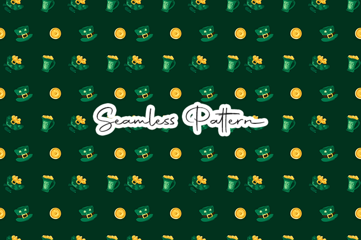 Bold seamless pattern featuring leprechaun hats, pots of gold, beer mugs, and gold coins on a rich green background. Perfect for fabric printing, scrapbooking, wrapping paper, sublimation, party decor, and seasonal craft projects. High quality digital paper ideal for festive and celebration themed designs.