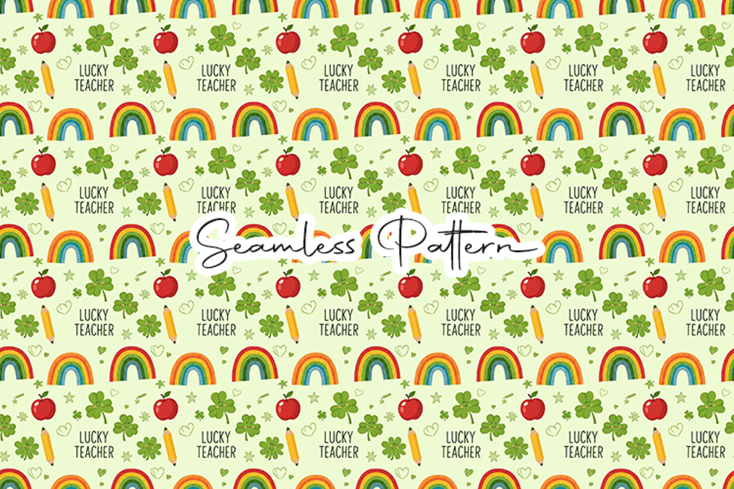 Colorful seamless pattern featuring lucky teacher text, rainbows, shamrocks, apples, and pencils on a soft green background. Perfect for fabric printing, sublimation, scrapbooking, wrapping paper, classroom decor, and seasonal craft projects. High quality digital paper ideal for teacher appreciation and festive themed designs.