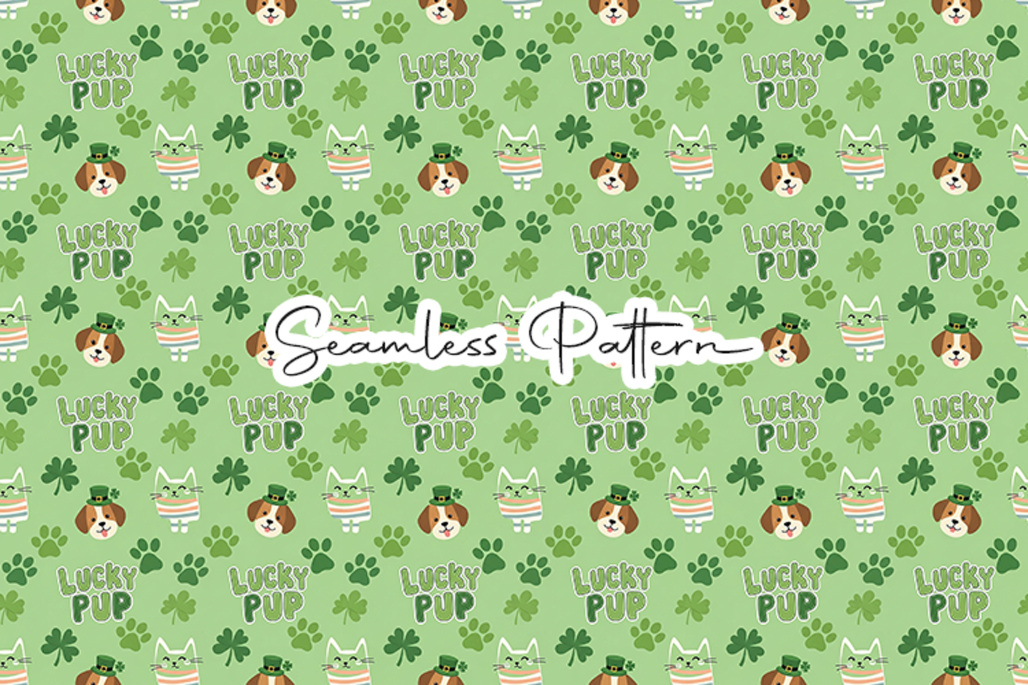 Adorable seamless pattern featuring lucky pup text, cute dogs in leprechaun hats, shamrocks, and paw prints on a soft green background. Perfect for fabric printing, scrapbooking, wrapping paper, sublimation, and seasonal craft projects. High quality digital paper ideal for pet lovers and festive themed designs.