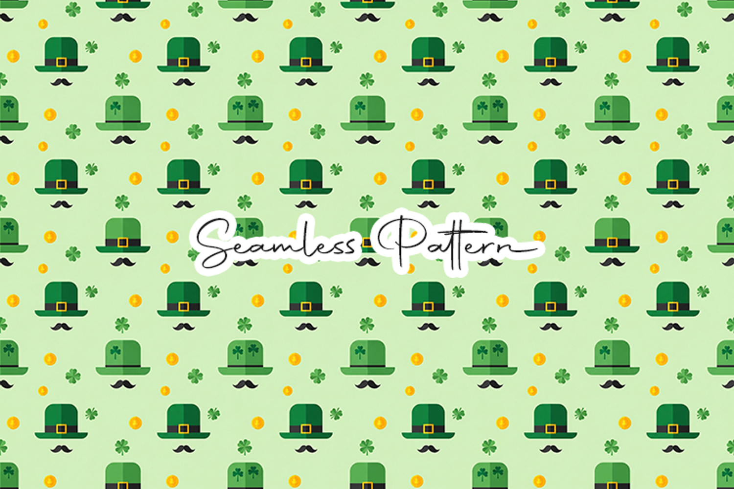 Green Mustache Seamless Pattern Irish St Patricks Day Clover Shamrock Luck Leprechaun Hat Gold Coins