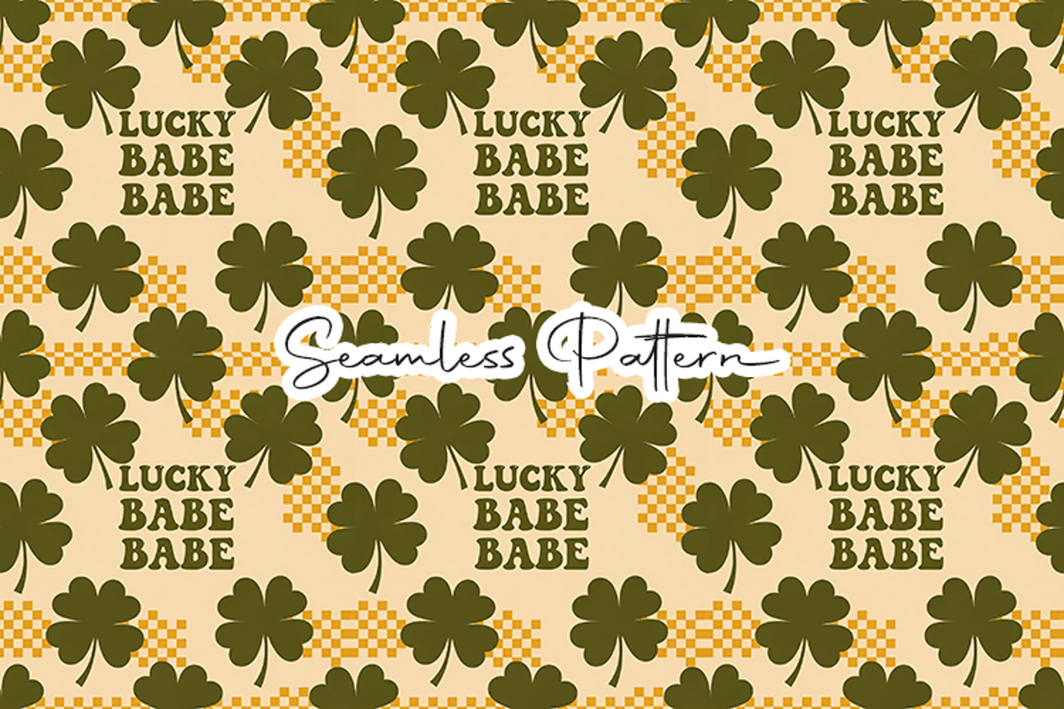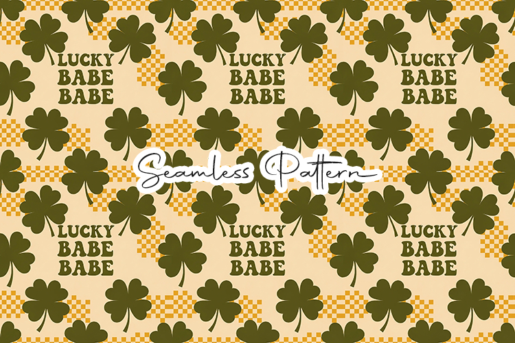Eye-catching retro seamless pattern featuring “Lucky Babe” lettering with bold shamrocks and warm checkered accents. Perfect for digital paper, fabric printing, wrapping paper, sublimation, scrapbooking, and trendy St. Patrick’s themed projects.