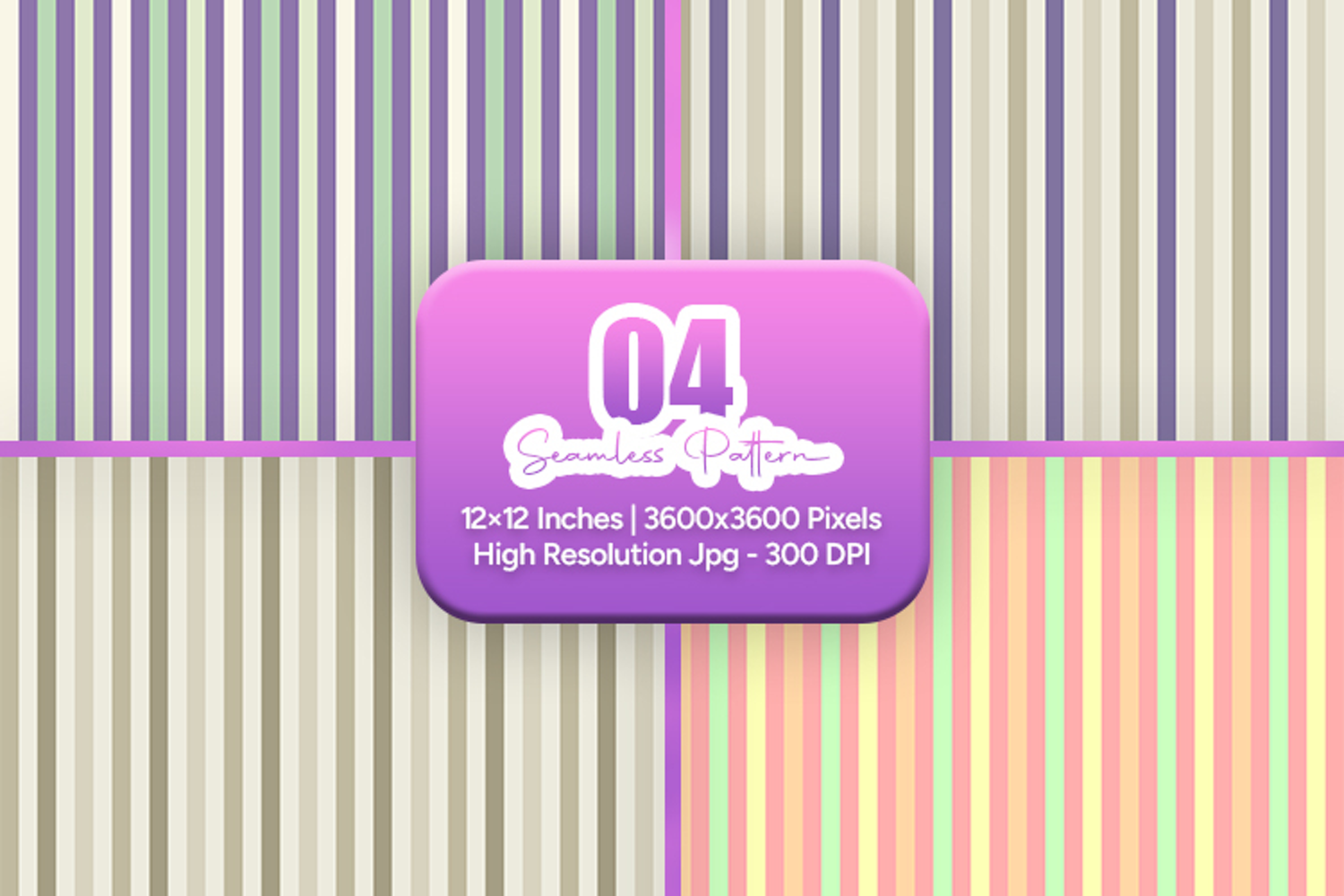 Vintage pastel vertical stripe seamless digital paper pack featuring soft lavender mint, warm beige, classic cream, and gentle peach tones. Perfect for fabric printing, scrapbooking, wrapping paper, sublimation, nursery themes, branding backgrounds, and DIY craft projects.