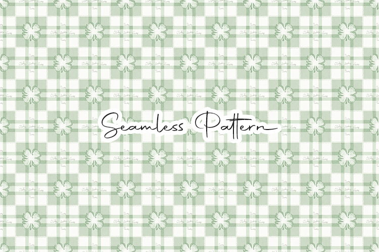Soft and elegant seamless pattern featuring delicate shamrocks over a sage green checkered background. Perfect for St. Patrick’s Day crafts, fabric printing, scrapbooking, wrapping paper, and seasonal decor projects. High-quality repeating design suitable for and use.