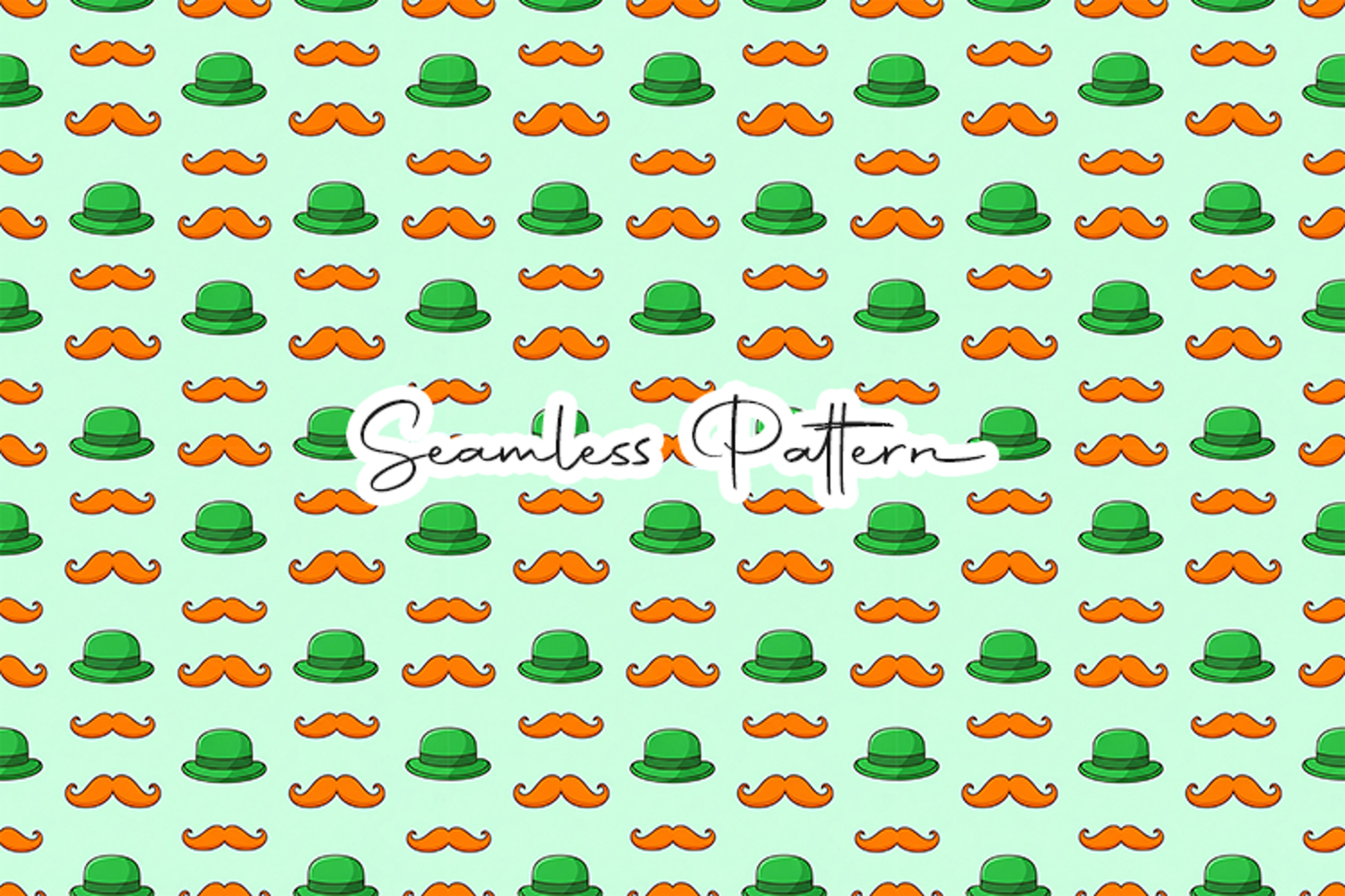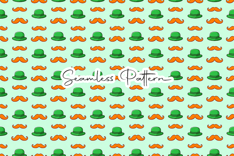 12x12 inch seamless pattern featuring a fun mix of green bowler hats and bright orange mustaches. 300 DPI JPG file. Ideal for humorous holiday apparel and gift wrap.