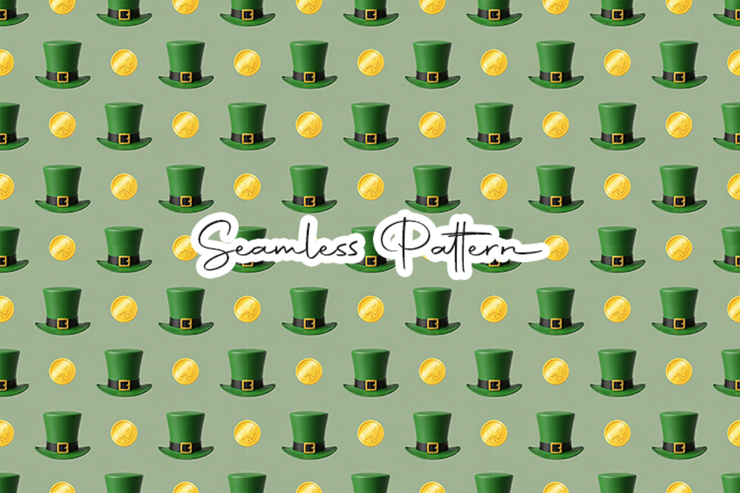 Vibrant 12x12 inch seamless pattern featuring a tiled layout of leprechaun hats and shining gold coins. 300 DPI JPG file. Ideal for festive holiday apparel and party printables.