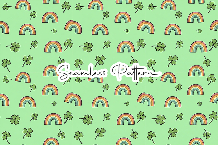 A playful 12x12 inch seamless pattern with hand-drawn style rainbows and clovers scattered across a soft green background. 300 DPI JPG file. Great for cheerful children's wear, holiday crafts, and creative digital projects.