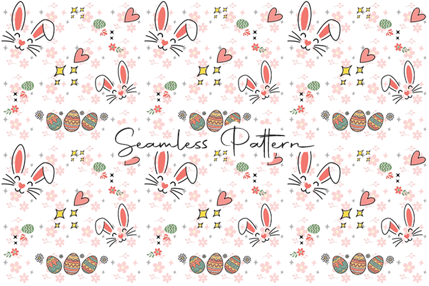 A lovely seamless pattern featuring cute bunnies, blooming flowers, and colorful Easter eggs. Perfect for garden-themed spring textiles, nursery wallpaper, and sophisticated holiday craft projects.