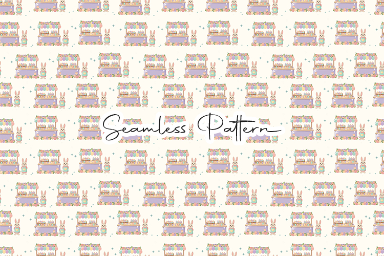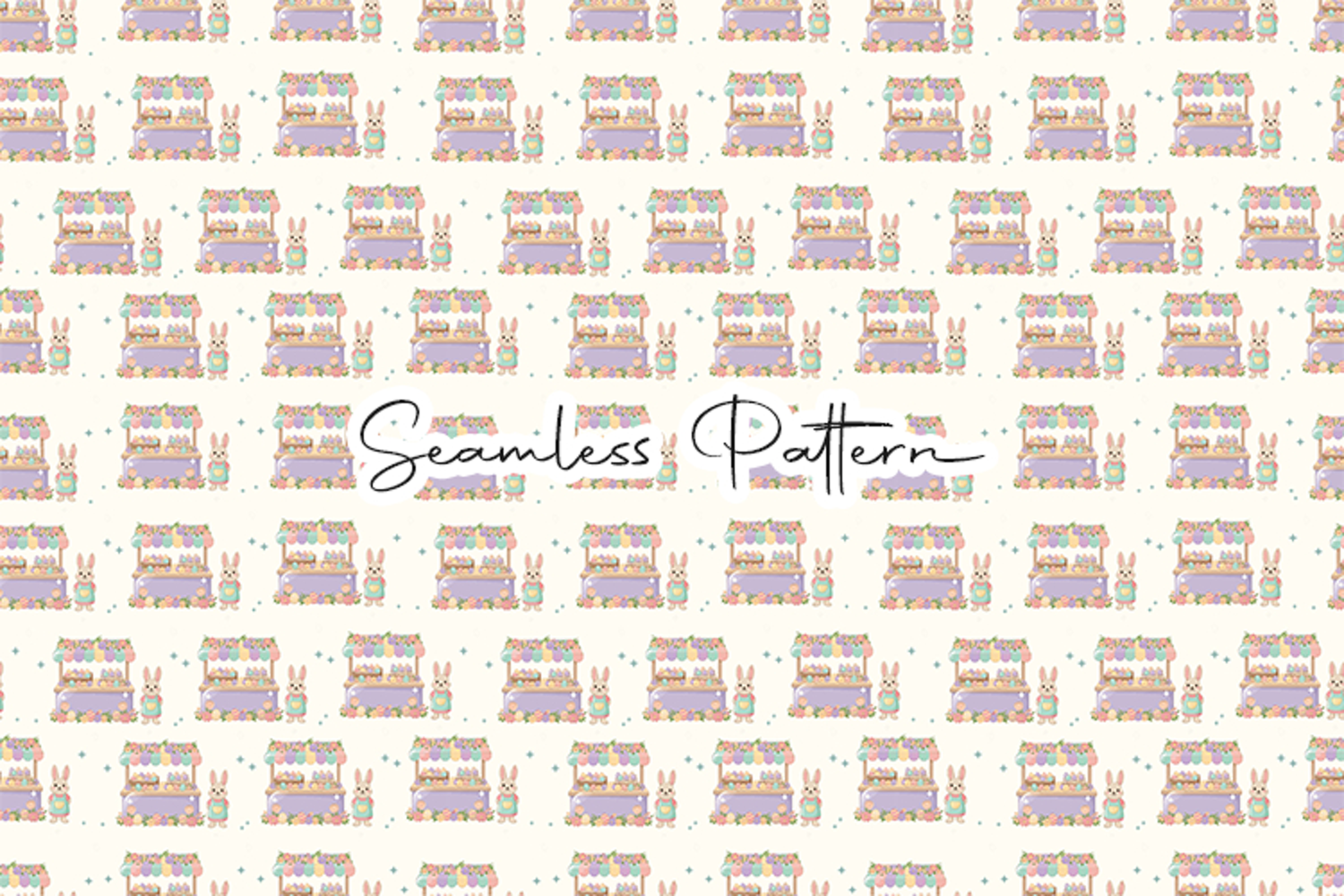 A detailed and charming seamless pattern featuring festive Easter market stalls filled with eggs and flowers. This high-quality design is ideal for holiday event branding, scrapbooking, and whimsical home decor.